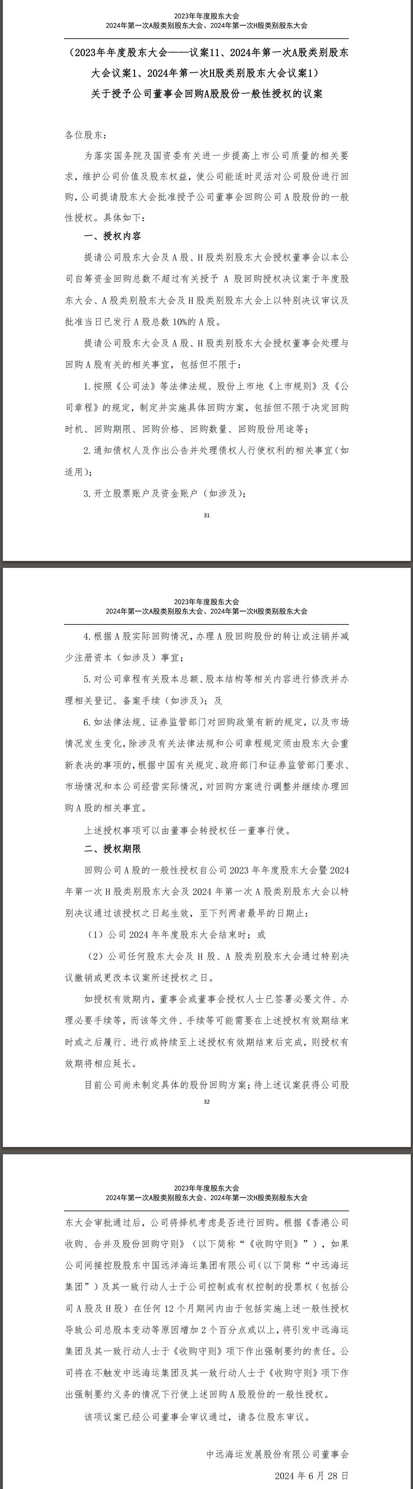 2024年6月28日,中远海发公司发布《2023年年度股东大会 2024年第一次A股类别股东大会、2024年第一次H股类别股东大会决议公告》,其中通过了《关于授予公司董事会回购A股股份一般性授权的议案》:提请公司股东大会及A 股、 H 股类别股东大会授权董事会以本公司自筹资金回购总数不超过有关授予 A 股回购授权决议案于年度股东大会、 A股类别股东大会及 H 股类别股东大会上以特别决议审议及批准当日已发行A股总数10%的A股。
