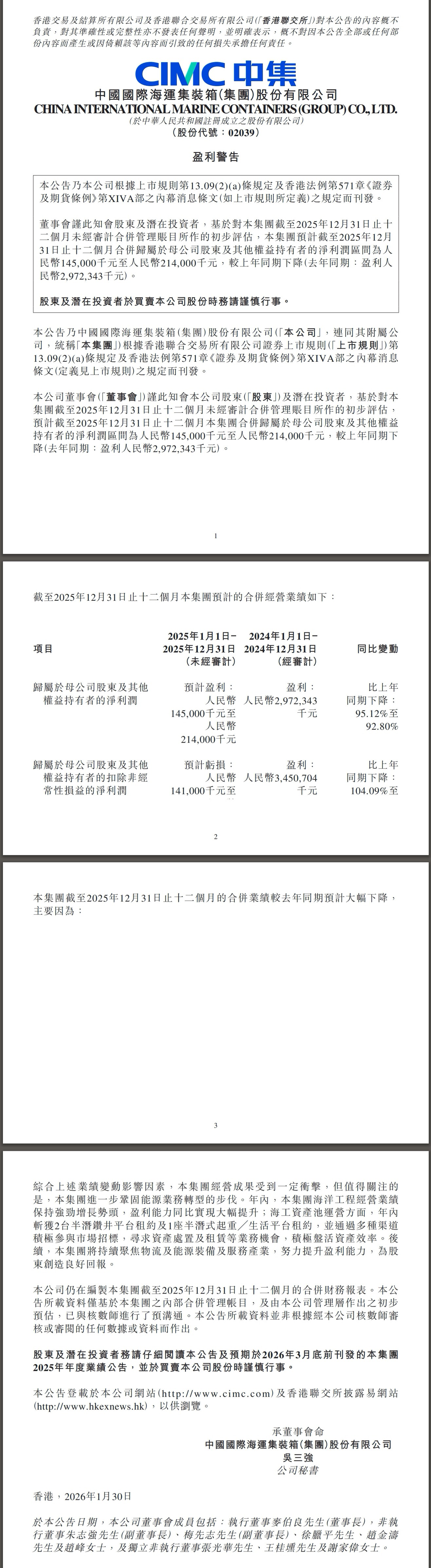 中集集团(000039)1月30日晚间披露2025年度业绩预告,预计2025年归母净利润1.45亿元至2.14亿元,同比下降92.8%-95.12%;扣非净利润亏损7200万元至1.41亿元,上年同期盈利34.51亿元;基本每股收益0.011元/股-0.024元/股。