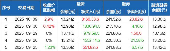 融资方面,当日融资买入2.26亿元,融资偿还1.94亿元,融资净买入3160.33万元。融券方面,融券卖出24.16万股,融券偿还3400股,融券余量241.52万股,融券余额598.97万元。融资融券余额合计13.3亿元。
