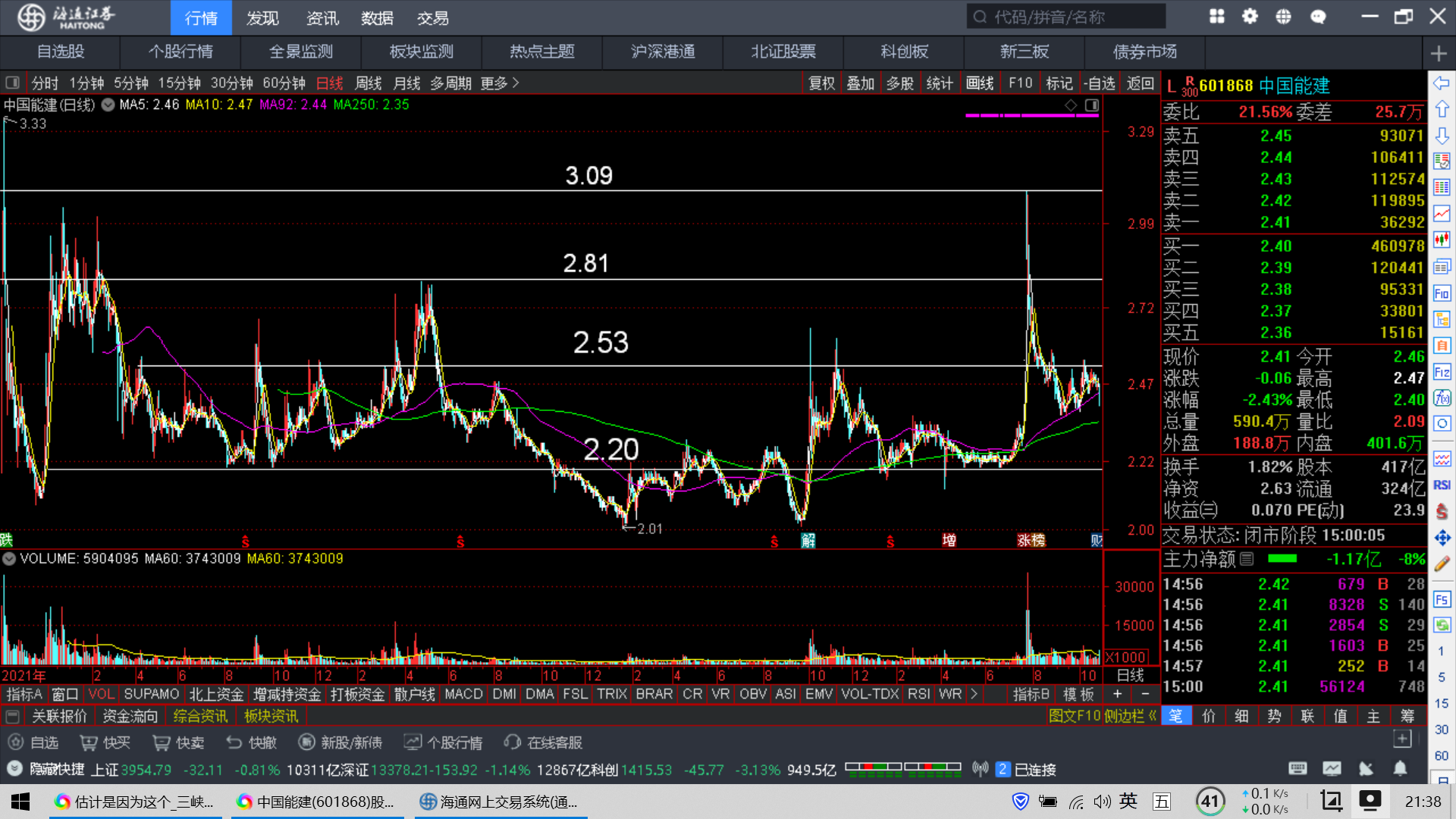 刚复盘,划了几条线,陪了我近4年的能建,虽然7月底清仓了,其实还是想再次买回来的。