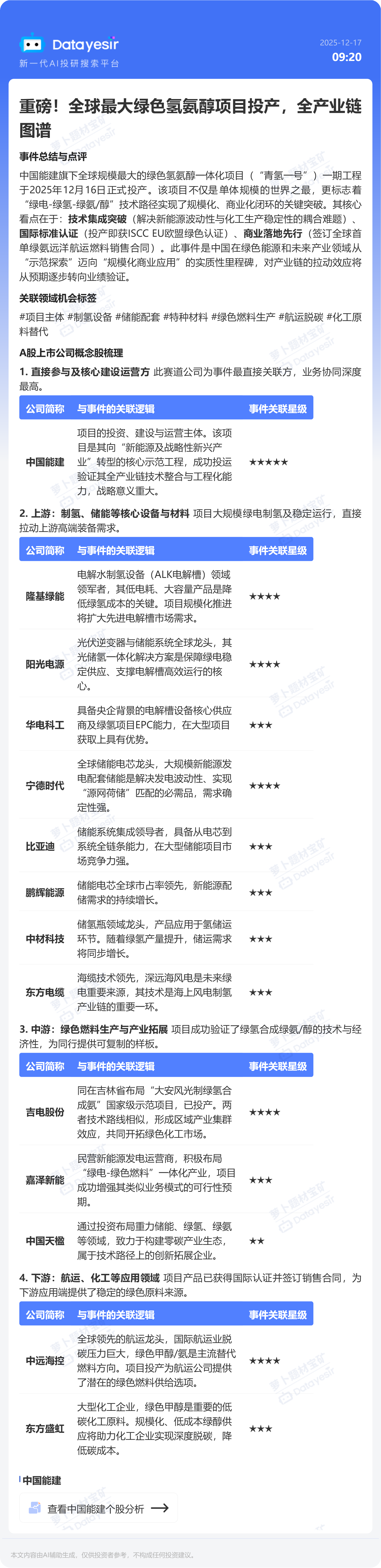 中国能建旗下全球规模最大的绿色氢氨醇一体化项目(“青氢一号”)一期工程于2025年12月16日正式投产。该项目不仅是单体规模的世界之最,更标志着“绿电-绿氢-绿氨/醇”技术路径实现了规模化、商业化闭环的关键突破。