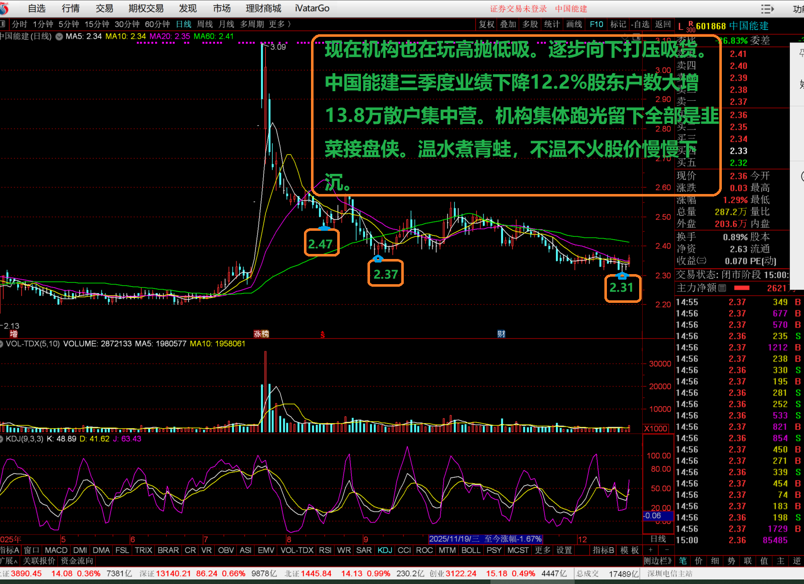 现在机构也在玩高抛低吸。逐步向下打压吸货。601868三季度业绩下降12.2%股