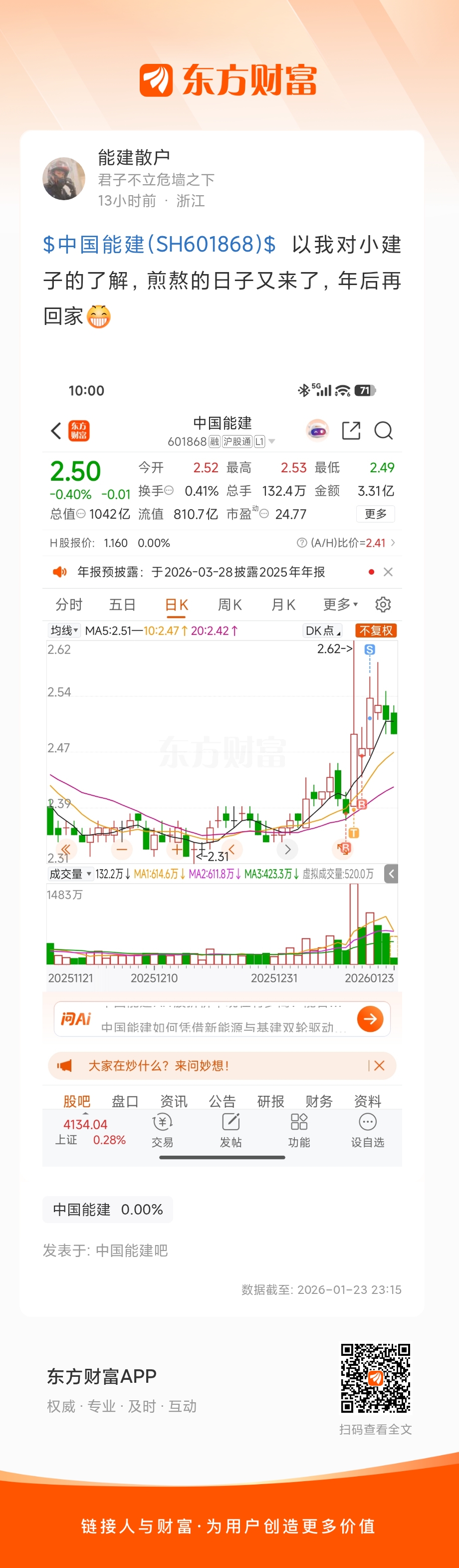 $中国能建(SH601868)$  以我对小建子的了解,煎熬的日子又来了,年后再回家