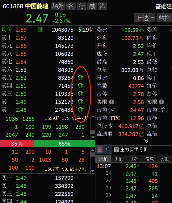 我们通过卖盘这五个“特”字就能看出庄家的态度,特字表示在这个价位有庄家挂的特大单。目的是让散户卖不出去。