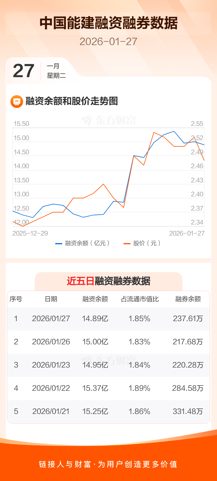 交易所最新数据显示,中国能建于2026年1月27日获融资买入2.08亿元,融资偿还2.19亿元,当日融资净偿还1051.59万元。目前,该股融资余额14.89亿,占流通市值比例为1.85%。