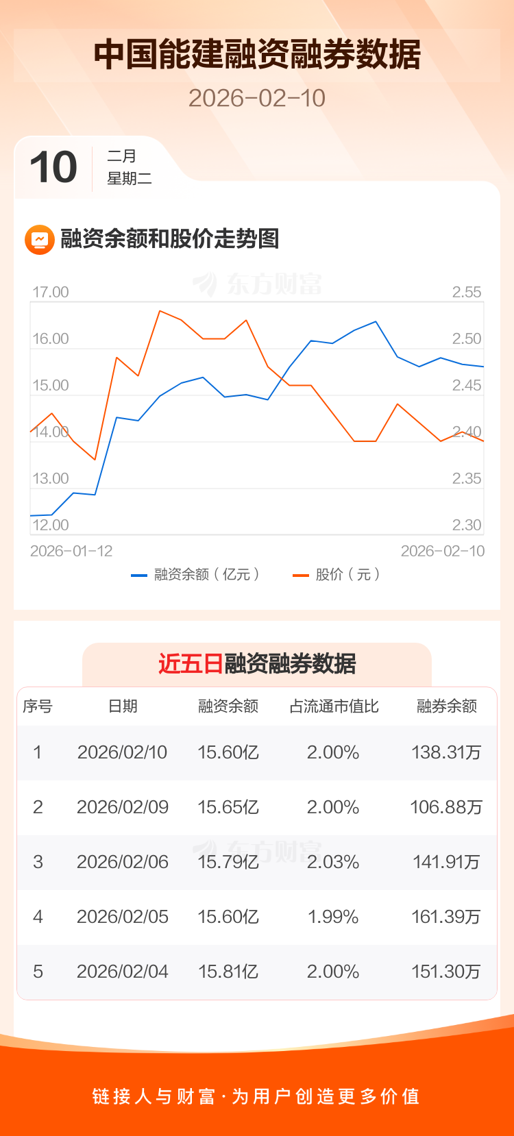 交易所最新数据显示,中国能建于2026年2月10日获融资买入1.05亿元,融资偿还1.10亿元,当日融资净偿还557.4万元。目前,该股融资余额15.60亿,占流通市值比例为2.00%。