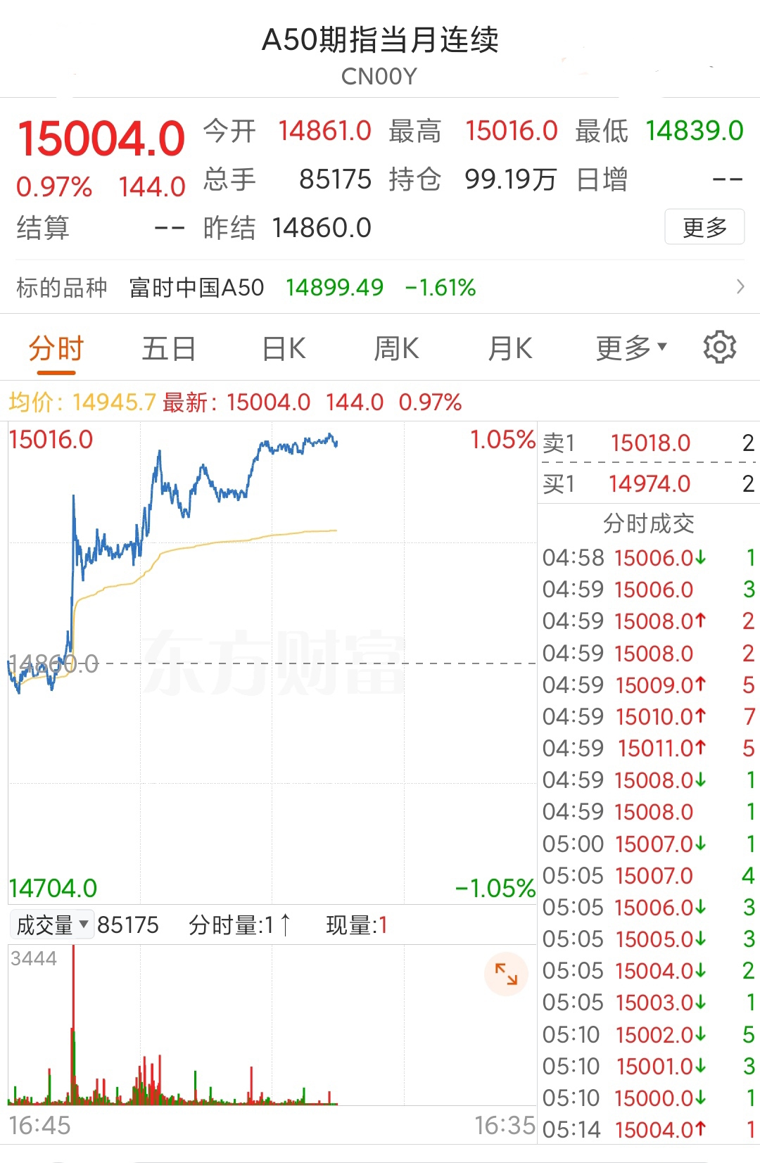周五晚上A50期指大涨0.97%,恒生指数期货大涨2.53%,恒生科技指数期货大