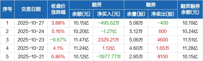 融资方面,当日融资买入2.54亿元,融资偿还2.59亿元,融资净偿还495.62万元。融券方面,融券卖出4600股,融券偿还5000股,融券余量5.08万股,融券余额474.37万元。融资融券余额合计10.19亿元。