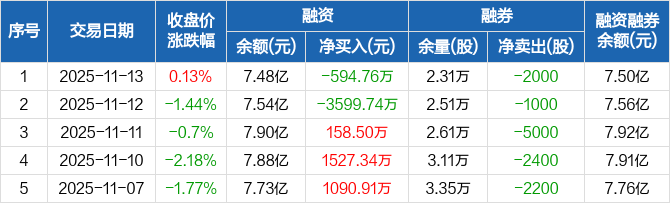 长飞光纤:融资净偿还594.76万元,融资余额7.48亿元(11-13)