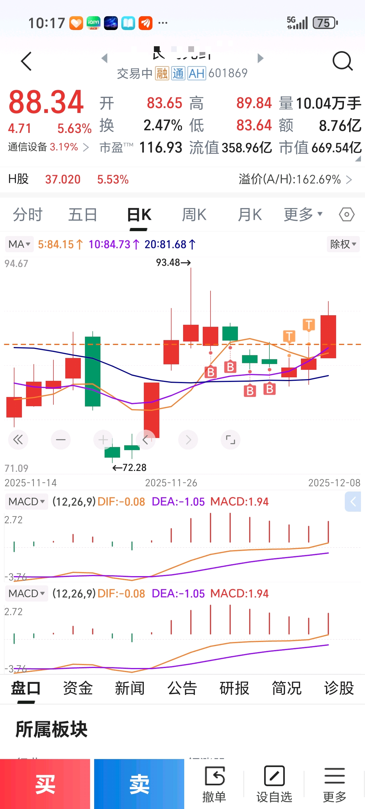 $长飞光纤(SH601869)$ 蓝瘦香菇,连续两日做T+减仓!