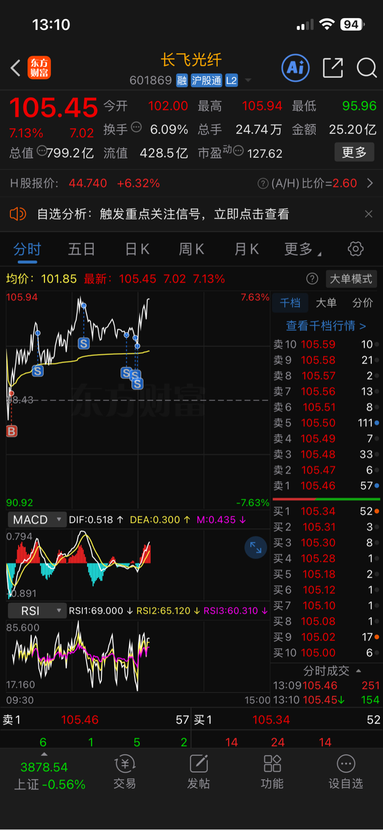 $长飞光纤(SH601869)$ #炒股日记# 曹 卖飞一万股