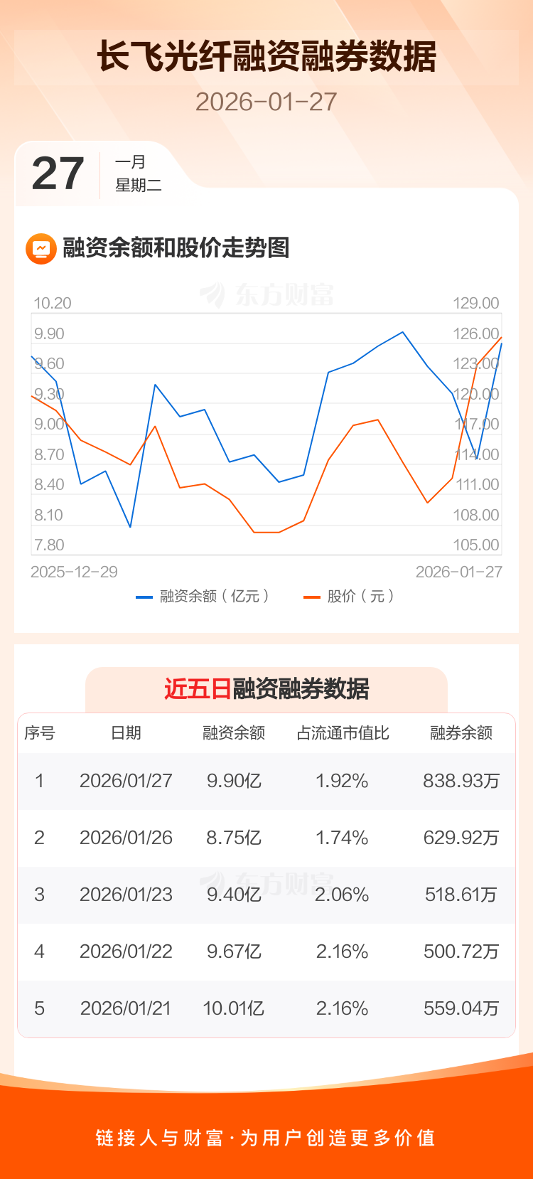 交易所最新数据显示,长飞光纤于2026年1月27日获融资买入3.30亿元,融资偿还2.15亿元,当日融资净买入1.15亿元。目前,该股融资余额9.90亿,占流通市值比例为1.92%。