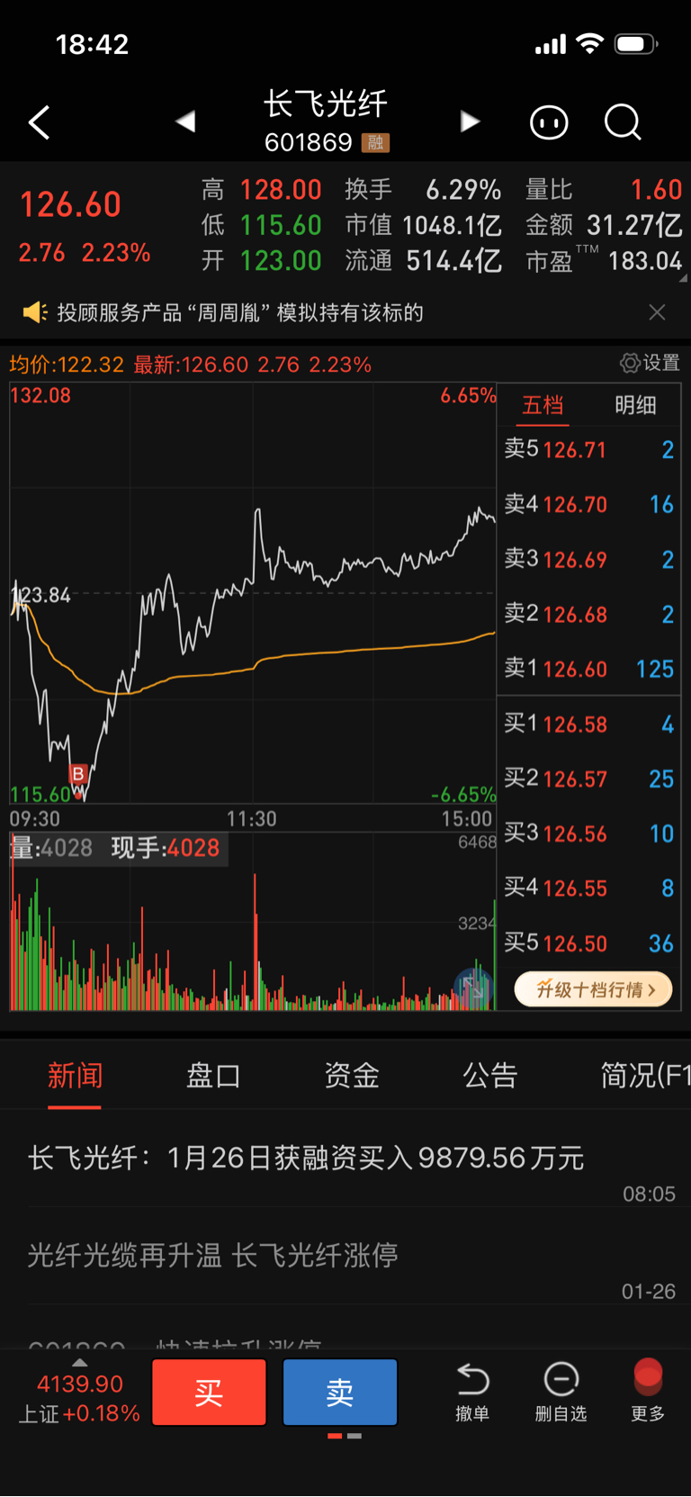 $长飞光纤(SH601869)$ 撤了,撤了,十几个点够了,下来再买