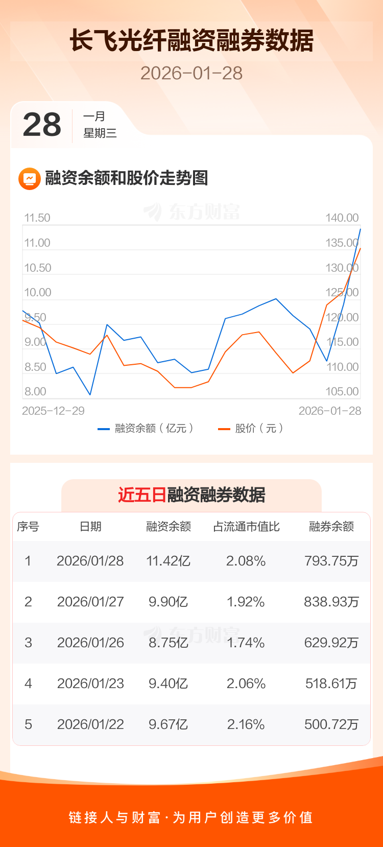 交易所最新数据显示,长飞光纤于2026年1月28日获融资买入5.68亿元,融资偿还4.16亿元,当日融资净买入1.52亿元。目前,该股融资余额11.42亿,占流通市值比例为2.08%。