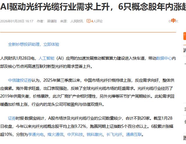 AI驱动光纤光缆行业需求上升,长飞光纤、通鼎互联、亨通光电等光纤股涨停板,光纤带