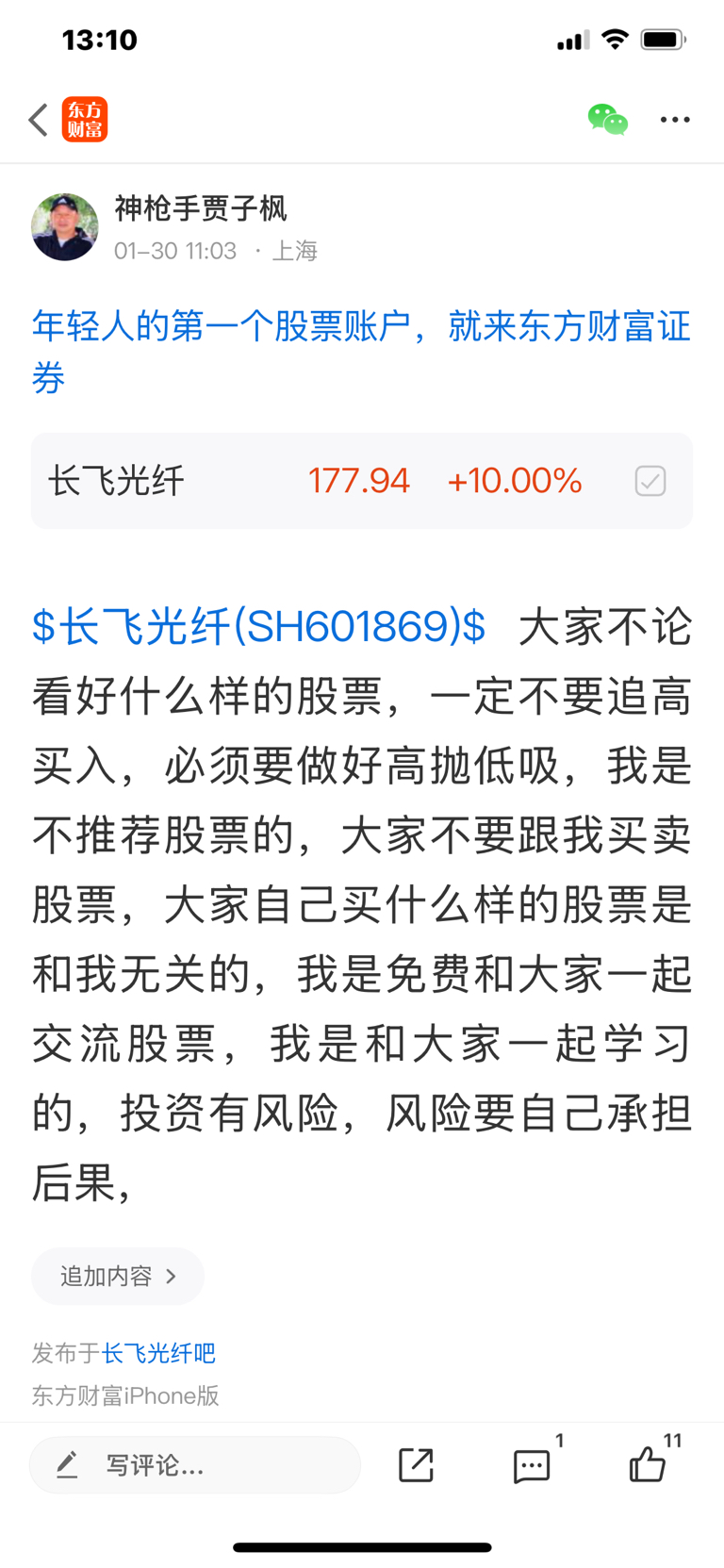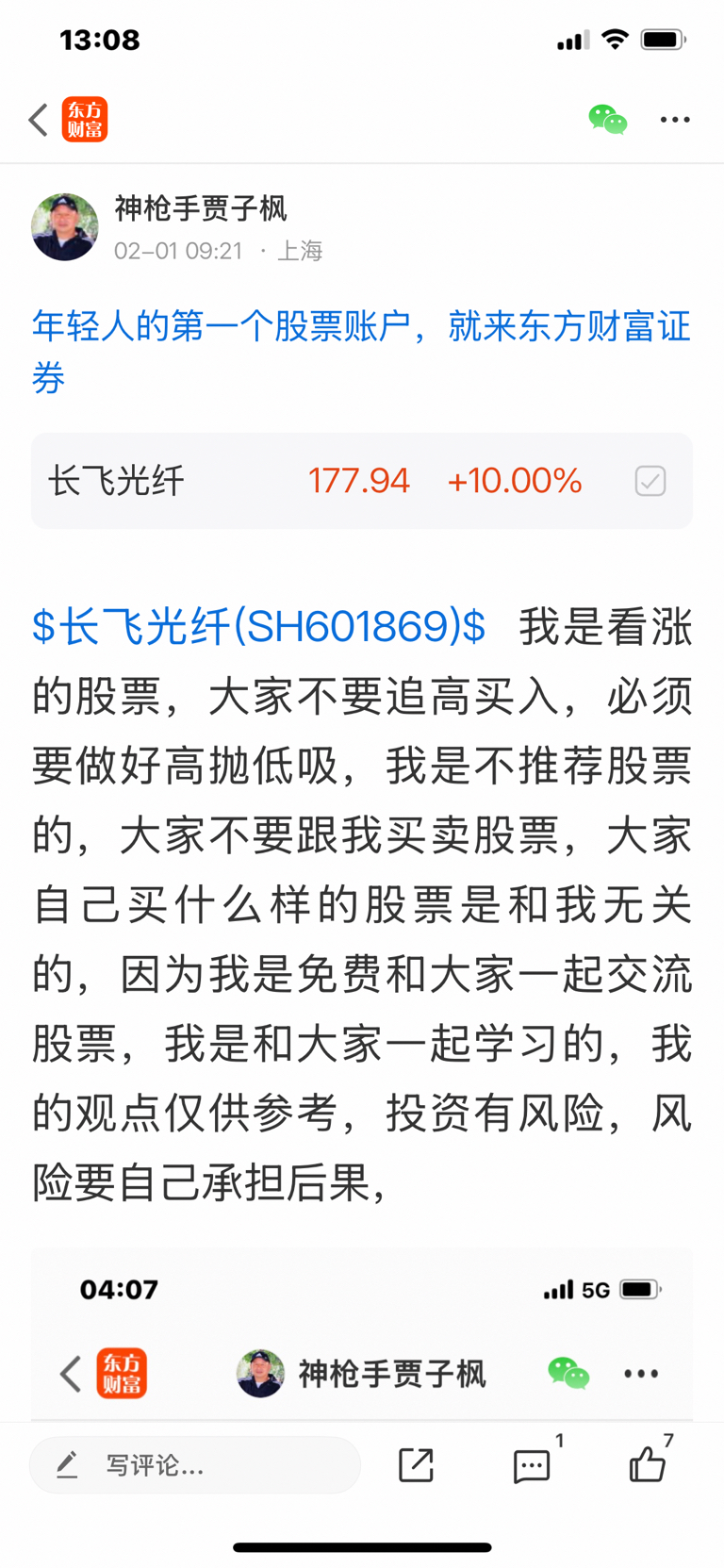 $长飞光纤(SH601869)$ 这个股是一月三十号发表文章看涨的股票,大家不要追高买入,必须要做好高抛低吸,我是不推荐股票的,大家不要跟我买卖股票,大家自己买什么样的股票是和我无关的,因为我是免费和大家一起交流股票,我是和大家一起学习的,我的观点仅供参考,投资有风险,风险要自己承担后果,