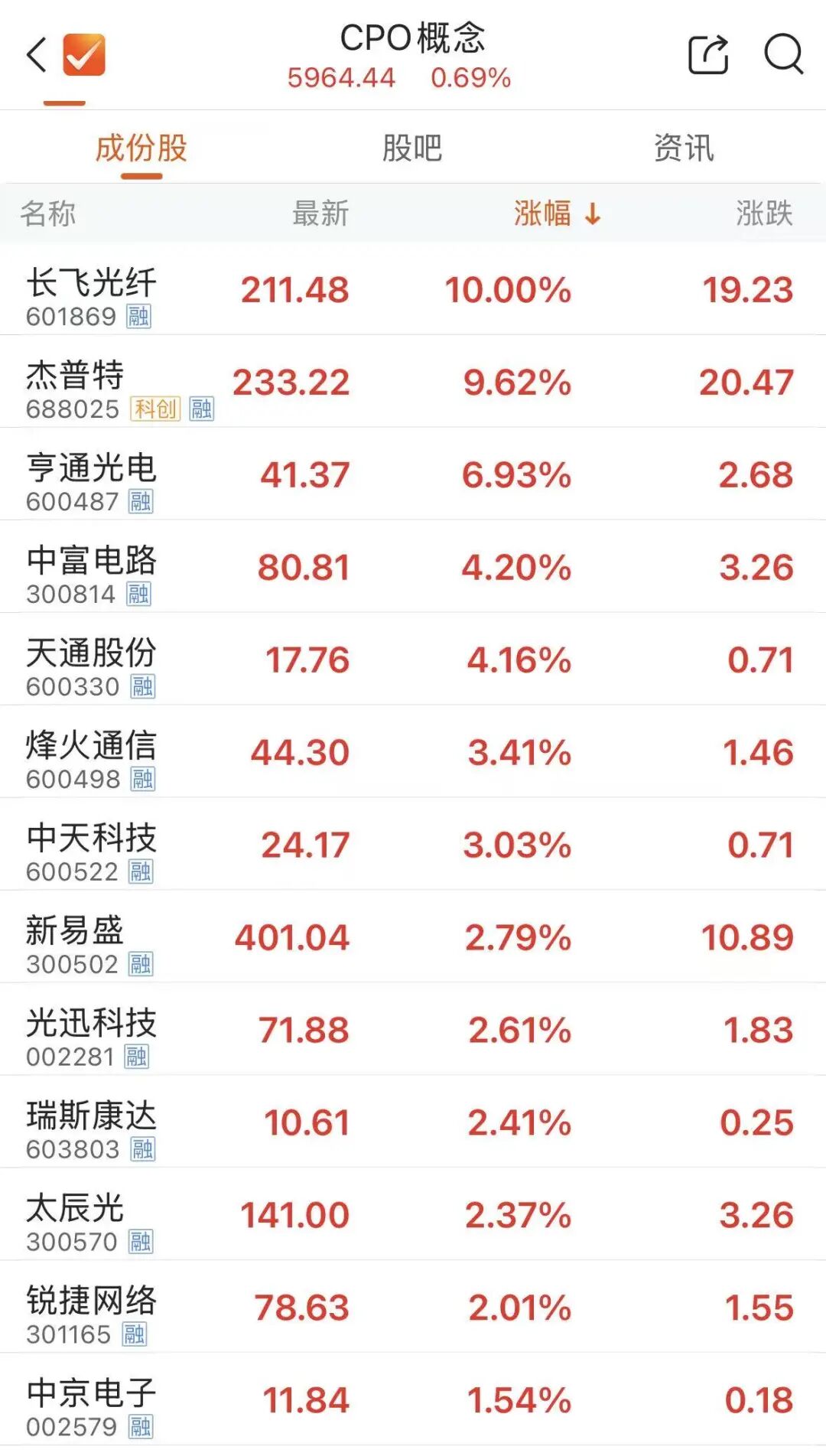 杰普特涨近10%,亨通光电涨近7%,中富电路、天通股份涨超4%。