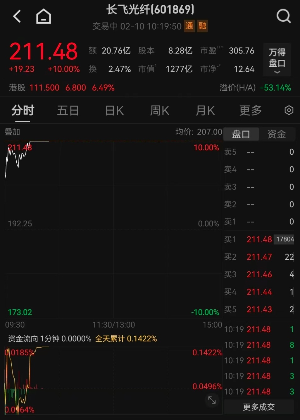 上证报中国证券网讯2月10日,长飞光纤开盘后震荡走高至涨停,实现两连板,报211.48元/股。