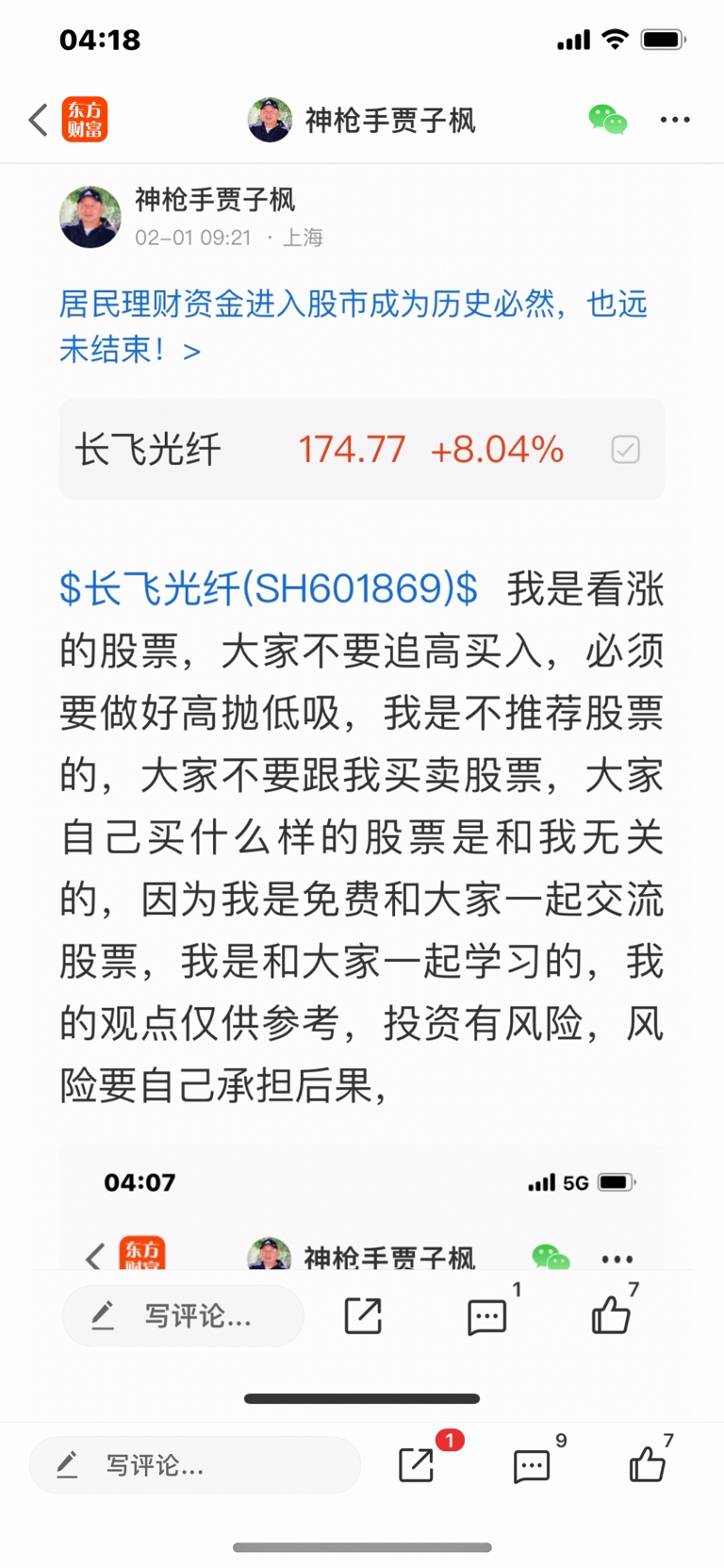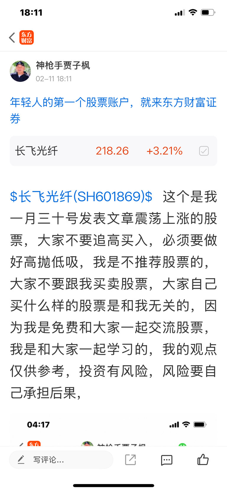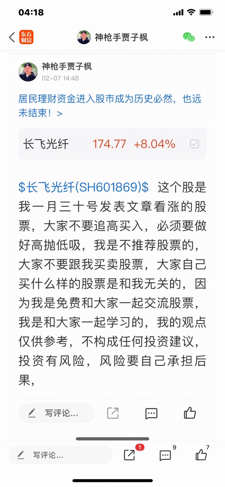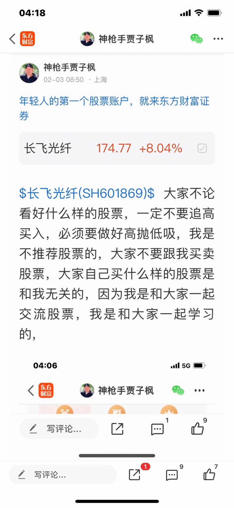 $长飞光纤(SH601869)$ 这个股是我一月三十号发表文章看涨的股票,大家不要追高买入,必须要做好高抛低吸,我是不推荐股票的,大家不要跟我买卖股票,大家自己买什么样的股票是和我无关的,因为我是免费和大家一起交流股票,我是和大家一起学习的,我的观点仅供参考,投资有风险,风险要自己承担后果,
