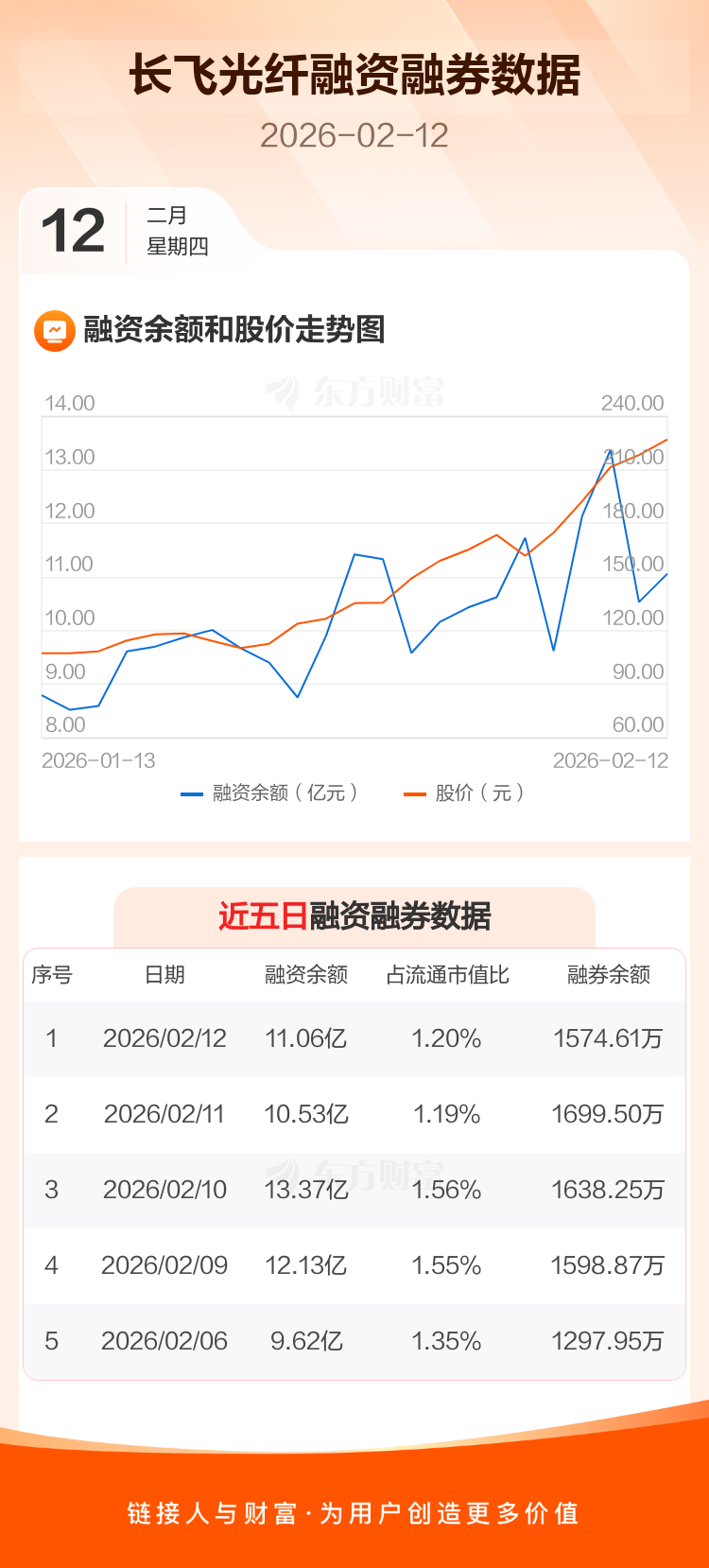 交易所最新数据显示,长飞光纤于2026年2月12日获融资买入3.91亿元,融资偿还3.38亿元,当日融资净买入5314.37万元。目前,该股融资余额11.06亿,占流通市值比例为1.20%。