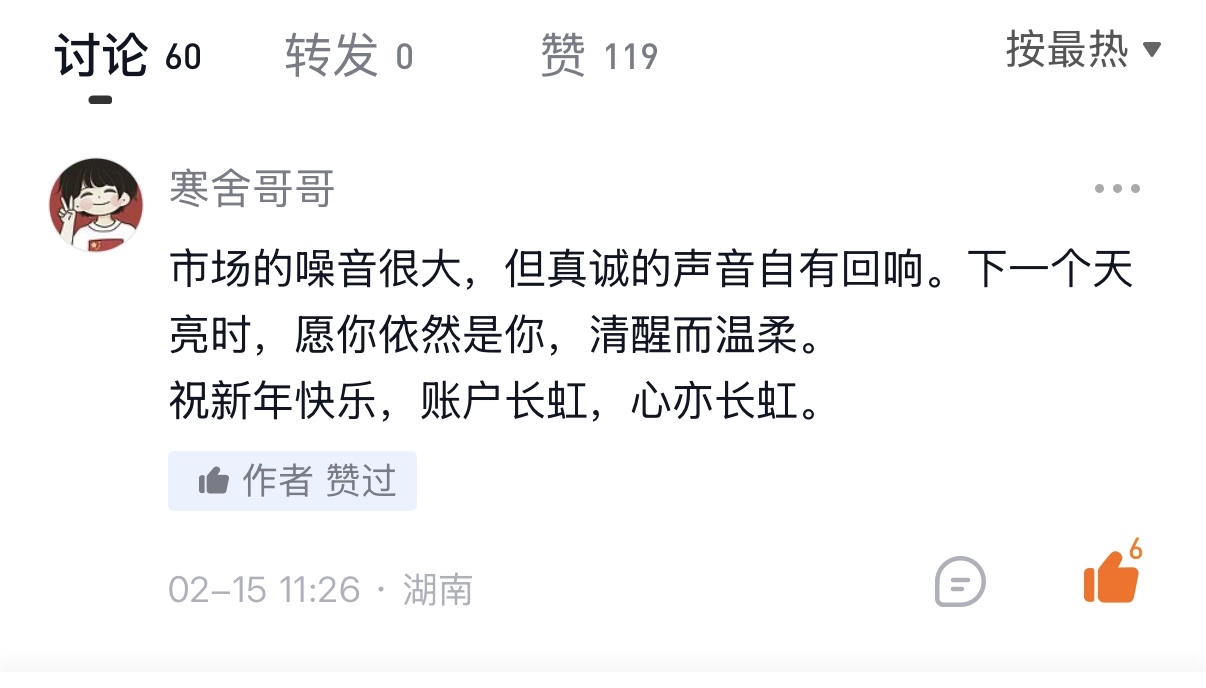借用粉丝的评论:市场的噪音很大,但真诚的声音自有回响。下一个天亮时,愿我依然是我