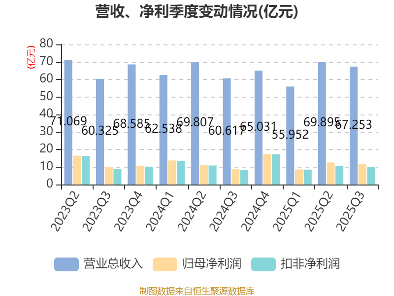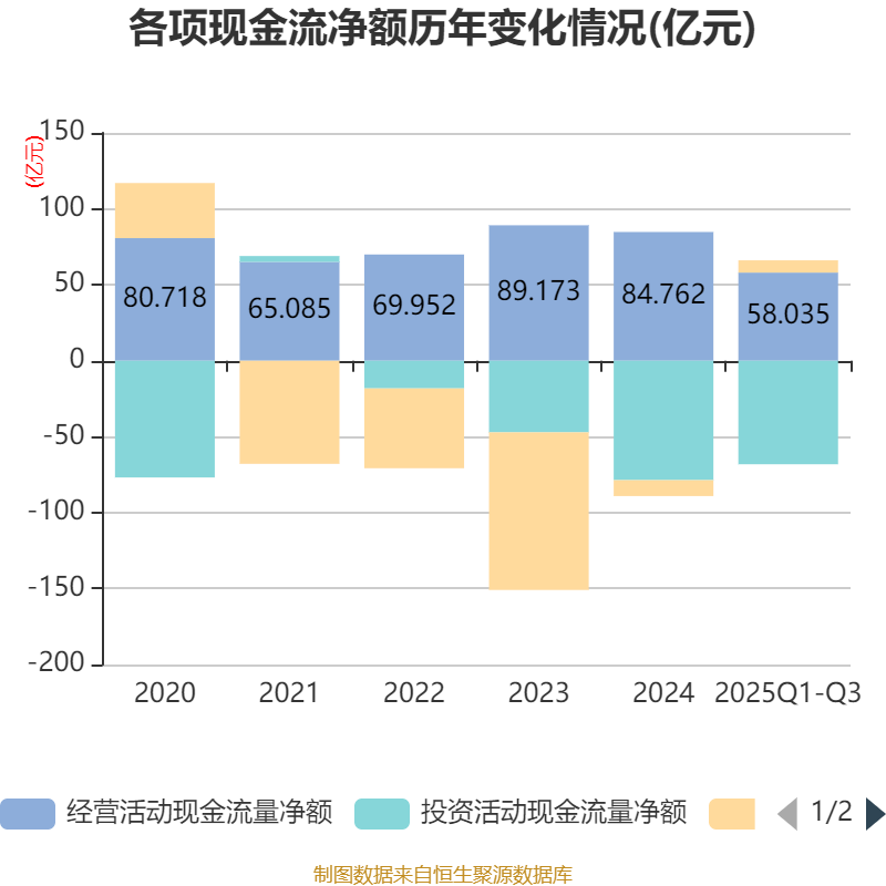 2025年前三季度,公司经营活动现金流净额为58.03亿元,同比下降9.35%;筹资活动现金流净额8.07亿元,同比增加14.45亿元;投资活动现金流净额-68.17亿元,上年同期为-66.94亿元。