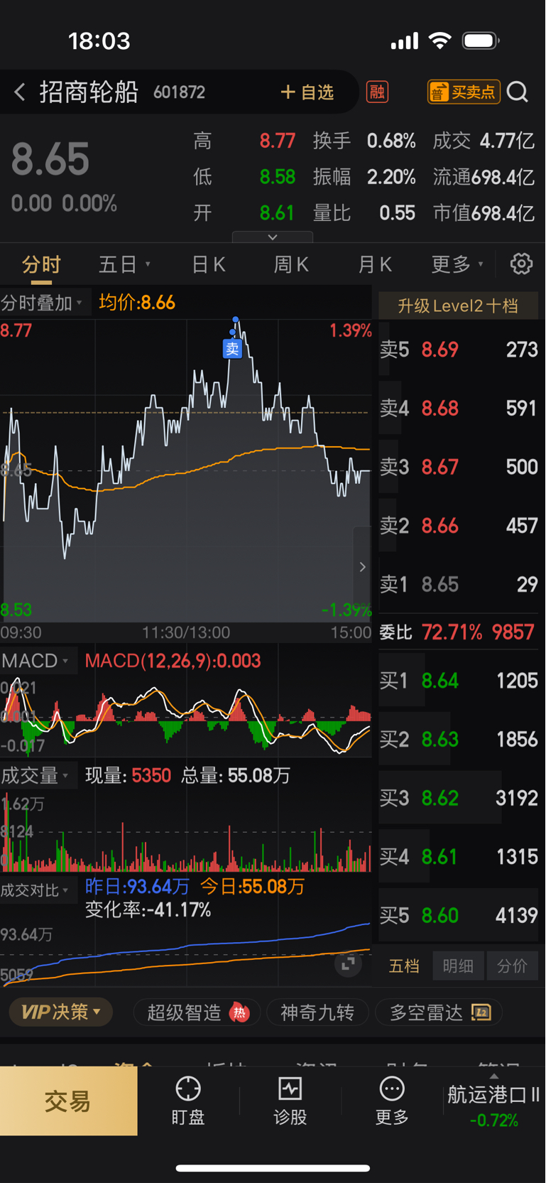 $招商轮船(SH601872)$ 走了十分之一,不然还见不到红