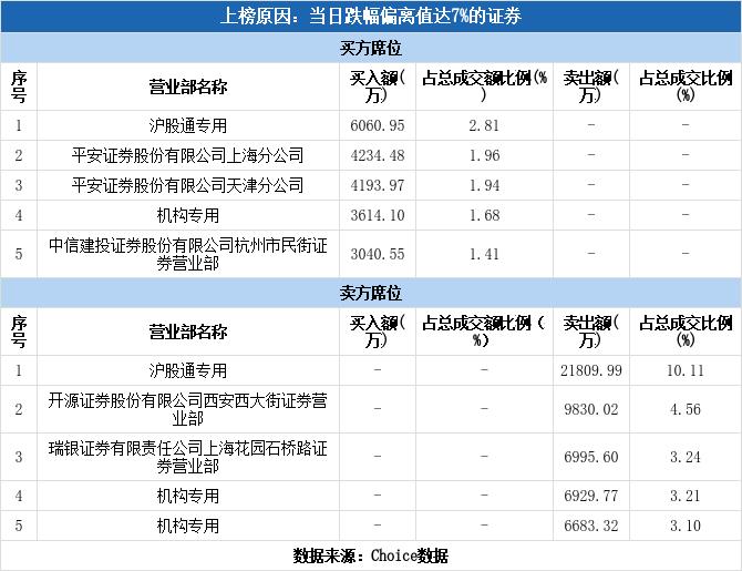 今日龙虎榜单上出现了沪股通的身影,占据了买一、卖一的位置,净卖出1.57亿,占当日成交总额的7.3%。除此之外沪股通还参与到了中远海能、实达集团、梅雁吉祥等11只个股中,其中5家呈现沪股通净买入,获净买入最多的是华夏幸福,净买额为3480.18万元;6家呈现沪股通净卖出,遭净卖出最高的为中远海能,净卖额为1.15亿元。