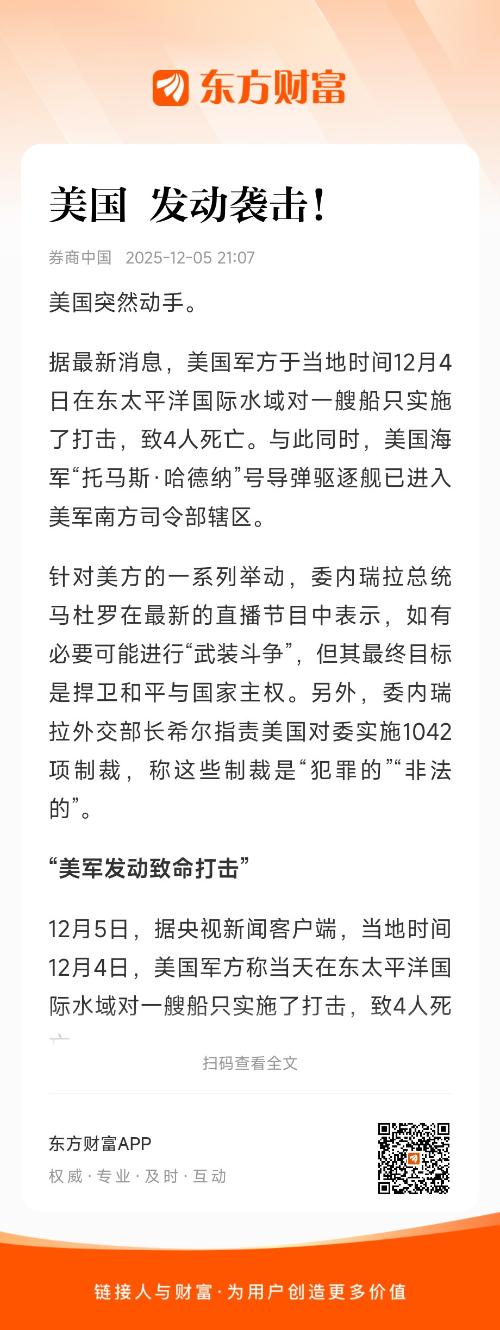 12月5日,据央视新闻客户端,当地时间12月4日,美国军方称当天在东太平洋国际水域对一艘船只实施了打击,致4人死亡。