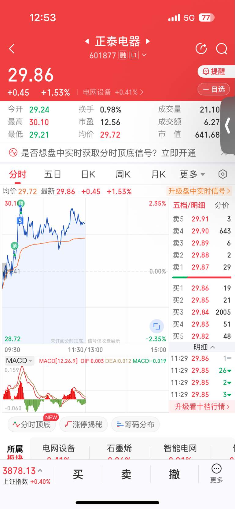 $正泰电器(SH601877)$ 昨天下午28.87加的35手、今天早盘挂的前天高点附近30.05竟然成功T出来了、感谢庄力、持续看好加油