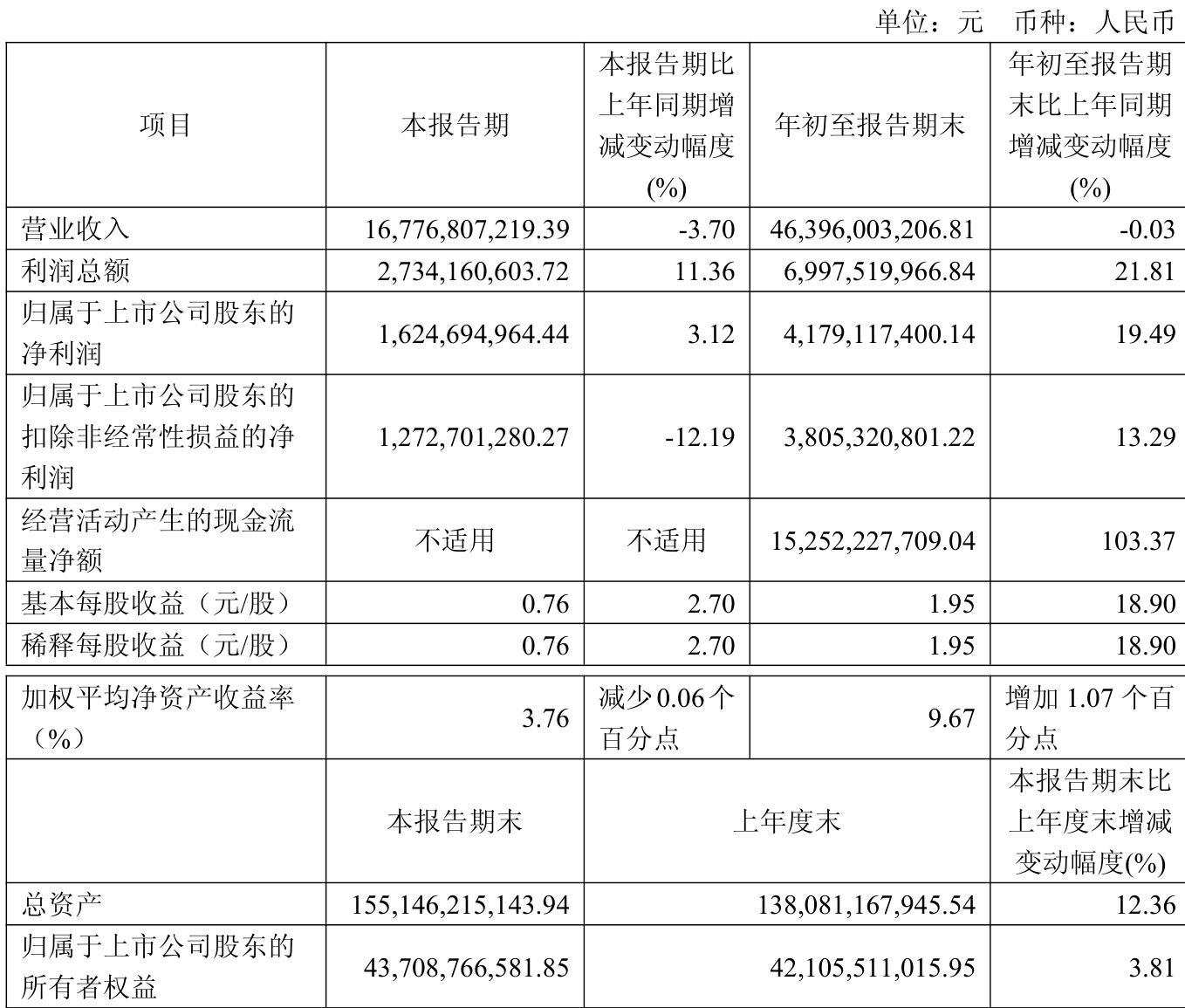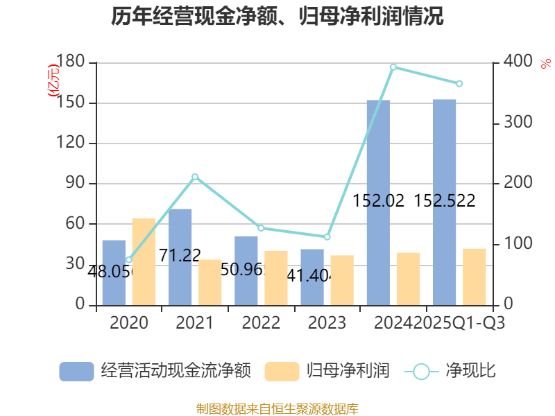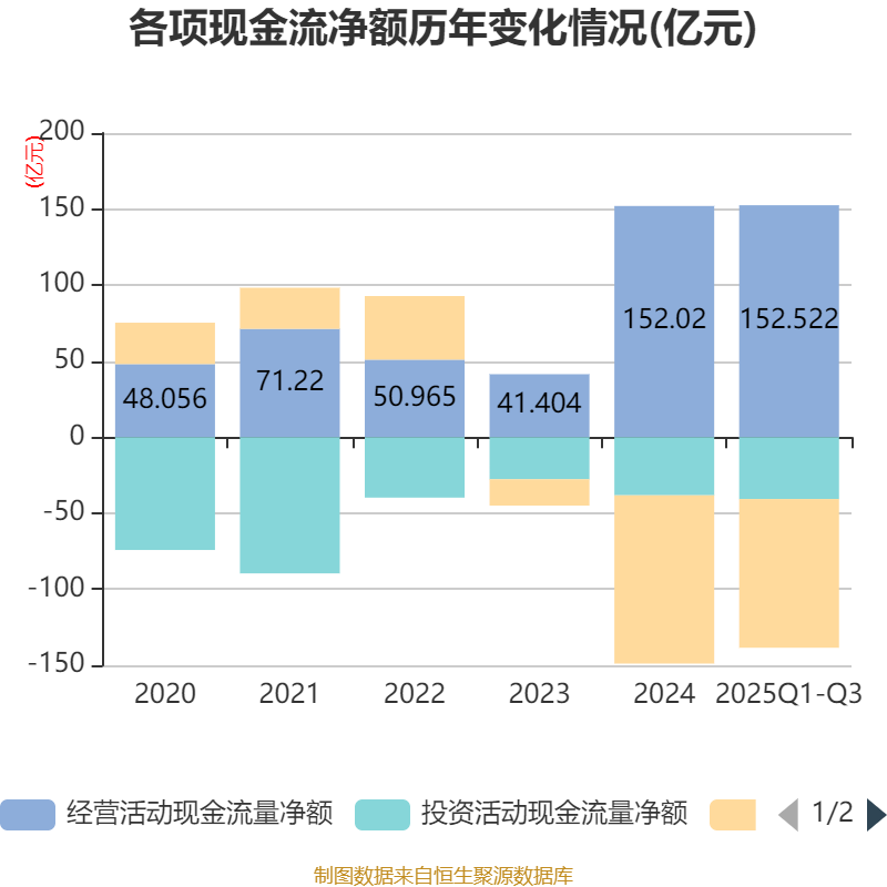 2025年前三季度,公司经营活动现金流净额为152.52亿元,同比增长103.37%;筹资活动现金流净额-97.79亿元,同比减少53.18亿元;投资活动现金流净额-40.7亿元,上年同期为-35.59亿元。
