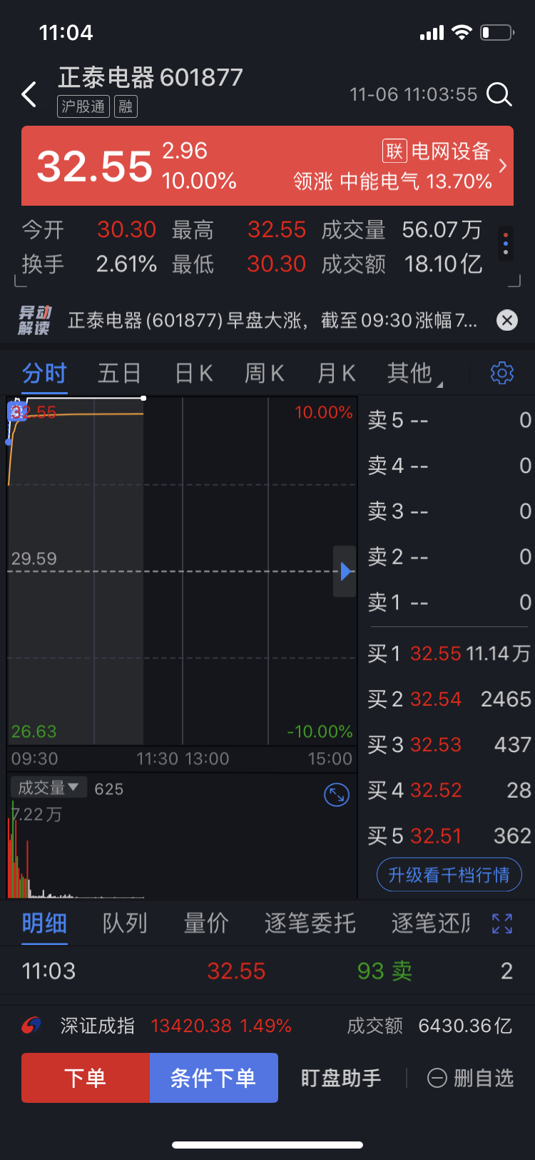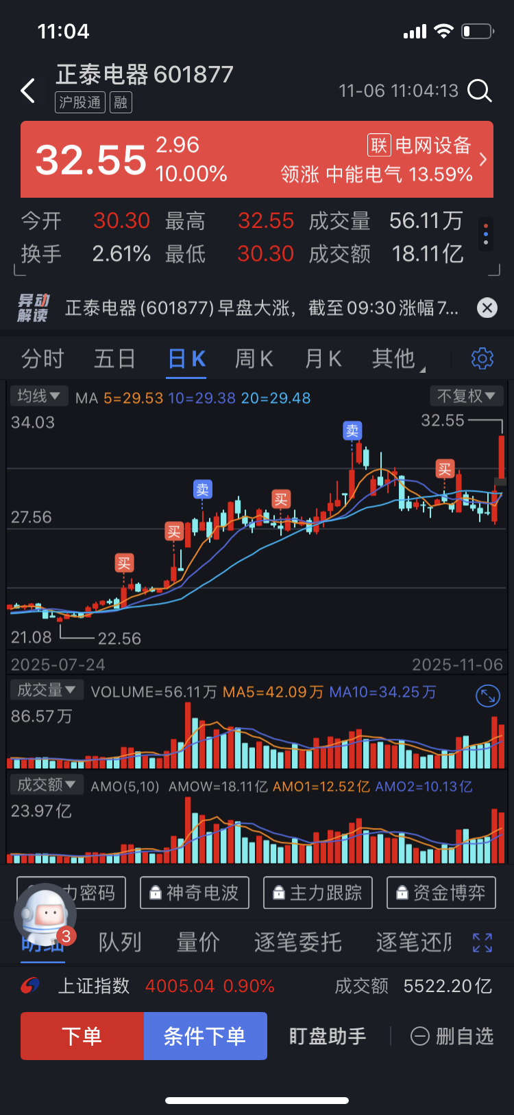 $正泰电器(SH601877)$ 今天开盘时挂涨停价卖出前期加仓的筹码,居然成交了。估计卖飞了,明天开盘应该冲一下再下来。