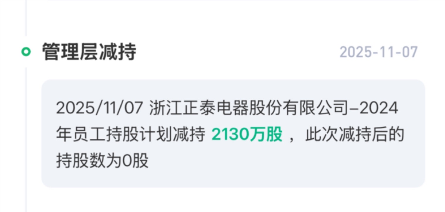 $正泰电器(SH601877)$ 恭喜这周接盘的散户,11.7号大涨那天,公司已经把24年员工持股的2100多万股一次性全部清仓卖给了现在接盘的散户,好聪明的公司,员工大赚,散户接盘,大家都有光明的未来。