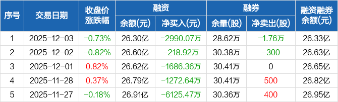 浙商证券融资融券信息显示,2025年12月3日融资净偿还2990.07万元;融资余额26.3亿元,较前一日下降1.12%