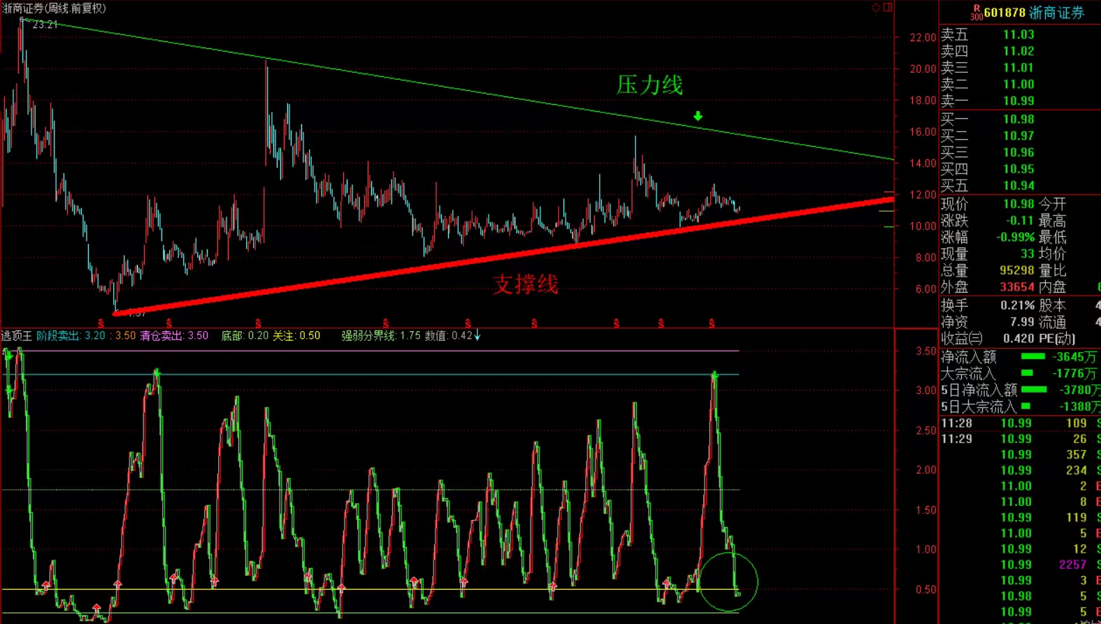 浙商证券不管是技术趋势指标,还是指标都处于三角形态的下轨底部区域,没有外部消息的利好或利差,只能耗时间慢慢磨了。这位置,下跌的空间也极为有限(除非有特大利空向下破位),向上也根本不会有暴拉概率,原因在于并表后的巨大商益差,本来的业绩也不亮丽,兼并后能少拖点后腿已是烧高香了。
