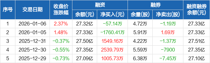 浙商证券:融资净偿还57.14万元,融资余额27.32亿元(01-06)