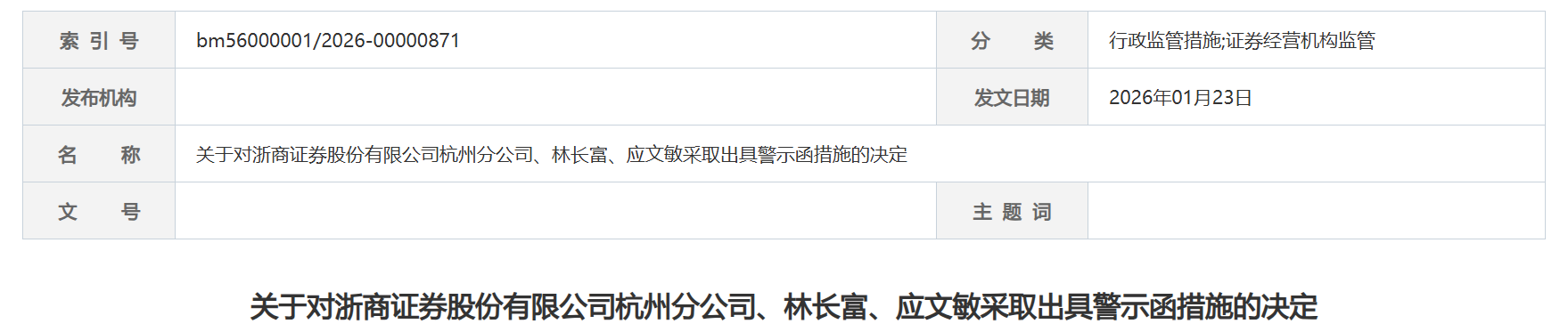 1月23日,浙江证监局官网发布的行政监管措施公告显示,浙商证券(601878)杭州分公司被出具警示函。