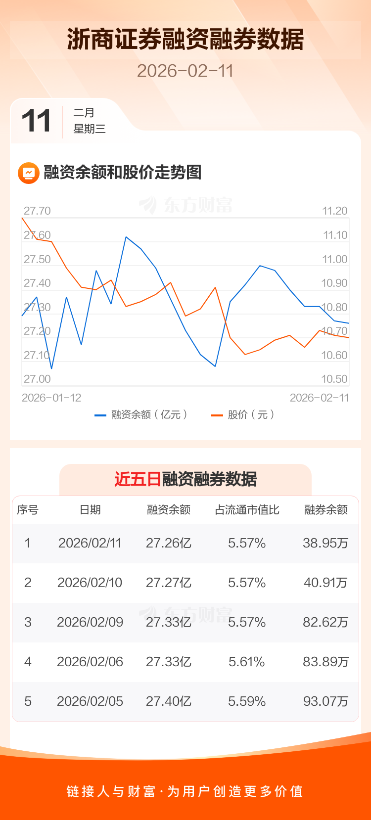 交易所最新数据显示,浙商证券于2026年2月11日获融资买入2631.64万元,融资偿还2754.39万元,当日融资净偿还122.75万元。目前,该股融资余额27.26亿,占流通市值比例为5.57%。