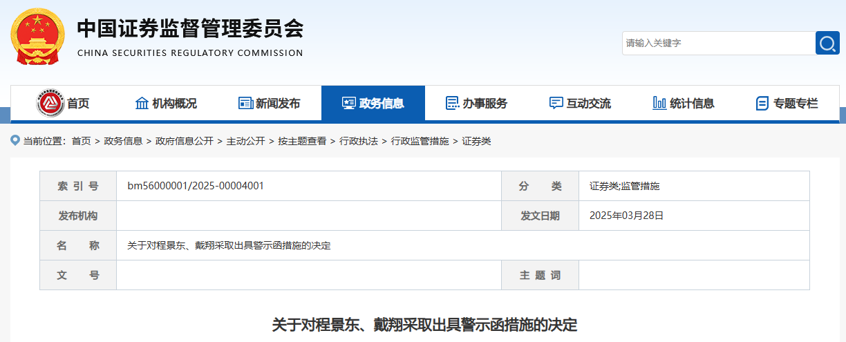 “程景东作为分管投行业务高管,戴翔作为投行质控部总经理,对上述问题负有责任。按照《证券发行上市保荐业务管理办法》第六十四条的规定,我会决定对你们采取出具警示函的行政监督管理措施。”证监会表示。