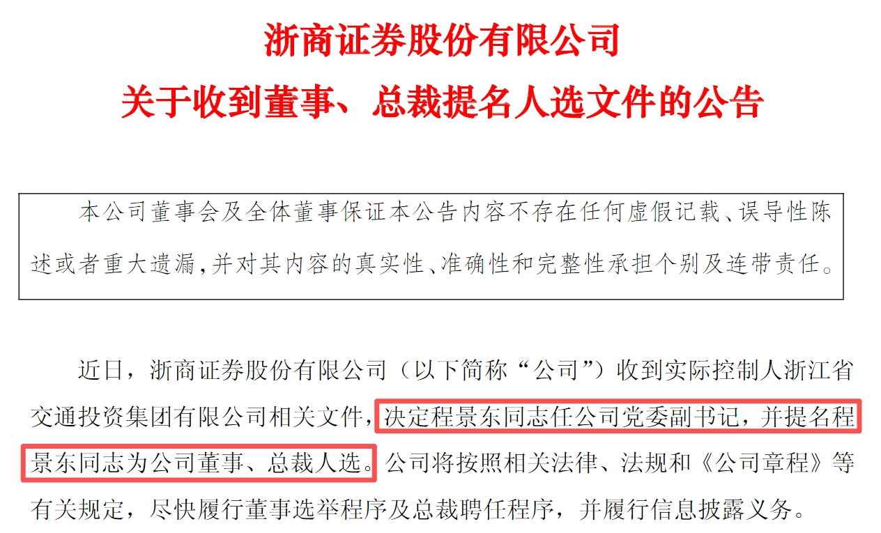 2月11日,浙商证券(601878.SH)迎来重要管理层调整。浙江交通集团正式宣布人事任免决定:现任浙商证券党委委员、副总裁程景东被任命为公司党委副书记,并提名为董事、总裁人选。
