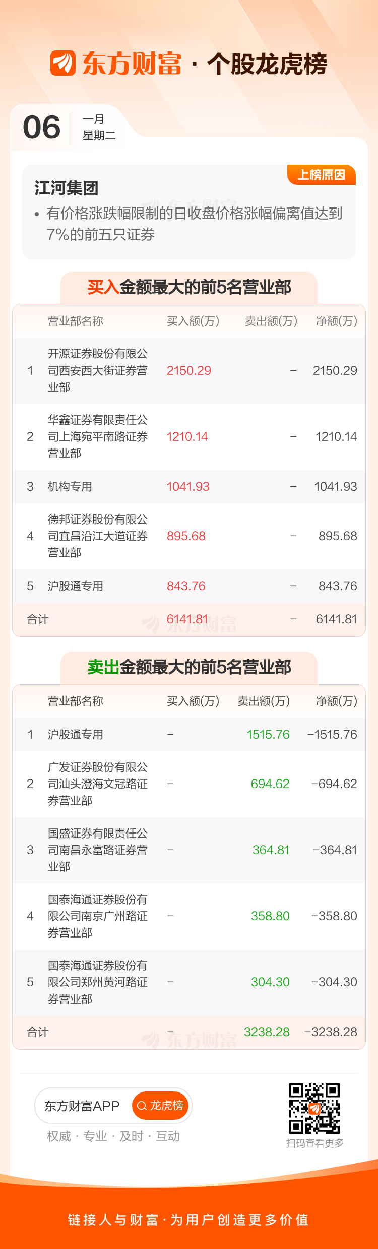 交易所2026年1月6日公布的交易公开信息显示,江河集团因成为有价格涨跌幅限制的日收盘价格涨幅偏离值达到7%的前五只证券上榜。江河集团当日收报8.97元,涨跌幅10.06%,偏离值8.56%,换手率1.54%,成交额1.52亿。