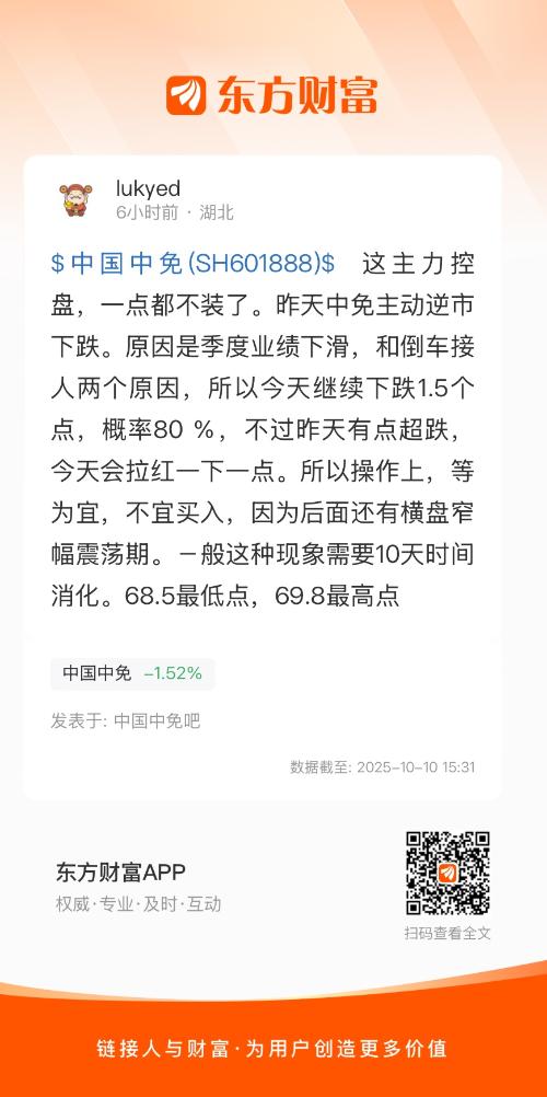 $中国中免(SH601888)$ 这主力控盘,一点都不装了。昨天中免主动逆市下跌。原因是季度业绩下滑,和倒车接人两个原因,所以今天继续下跌1.5个点,概率80 %,不过昨天有点超跌,今天会拉红一下一点。所以操作上,等为宜,不宜买入,因为后面还有横盘窄幅震荡期。-般这种现象需要10天时间消化。68.5最低点,69.8最高点