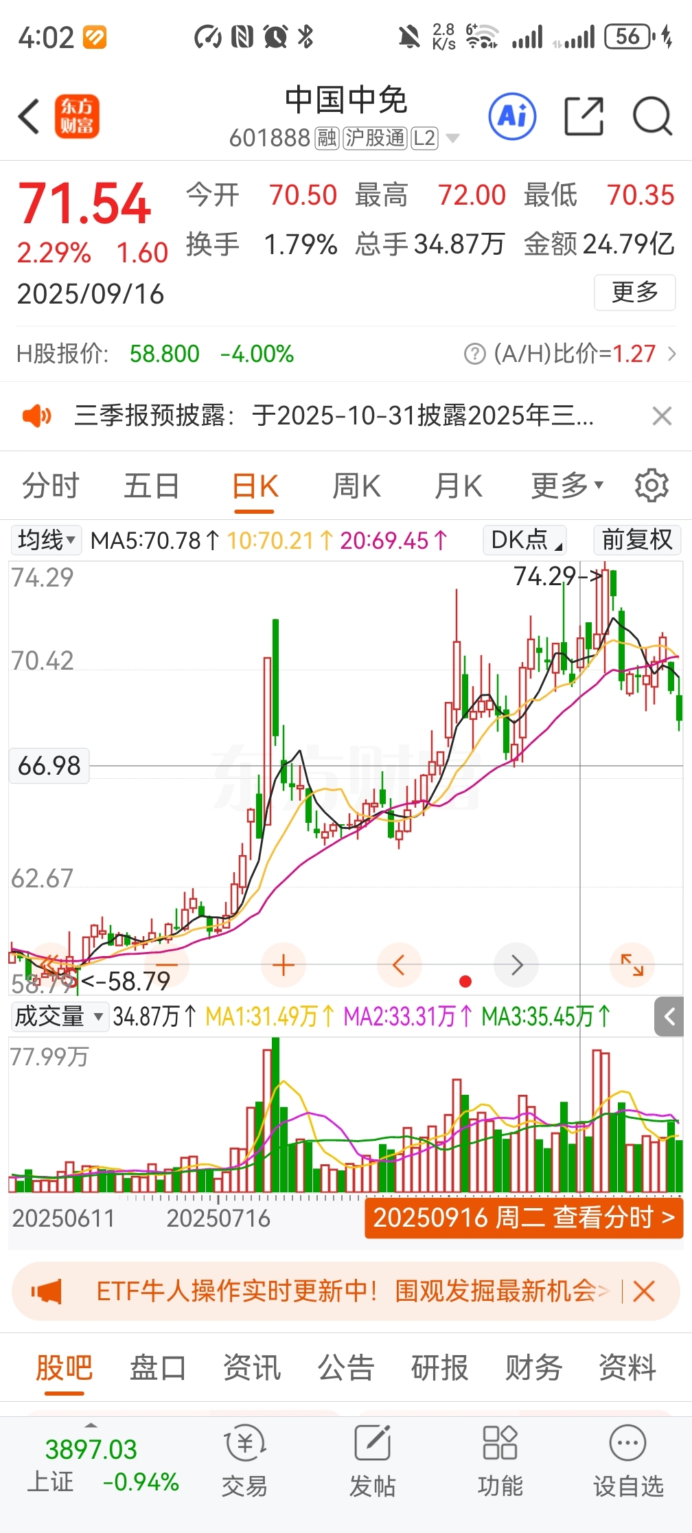 $中国中免(SH601888)$ 按照港股的走势推测。起码要跌到这里。今天我先不买了,下个星期等大跌。