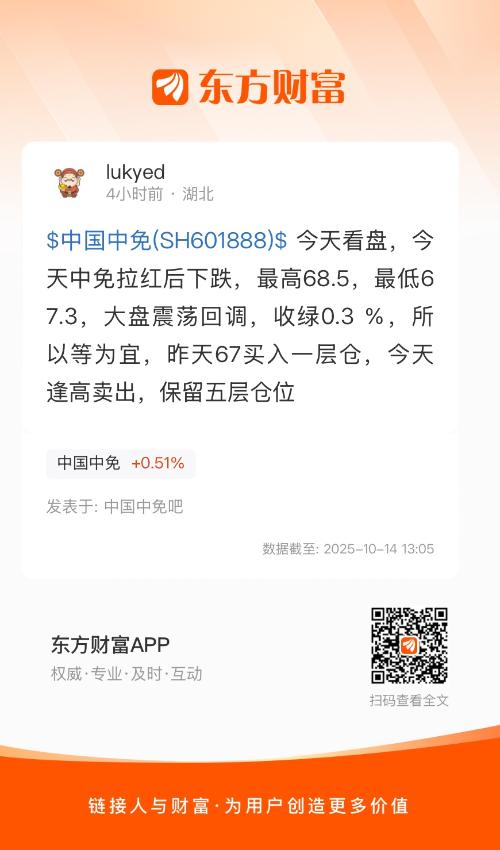 $中国中免(SH601888)$ 今天看盘,今天中免拉红后下跌,最高68.5,最低67.3,大盘震荡回调,收绿0.3 %,所以等为宜,昨天67买入一层仓,今天逢高卖出,保留五层仓位