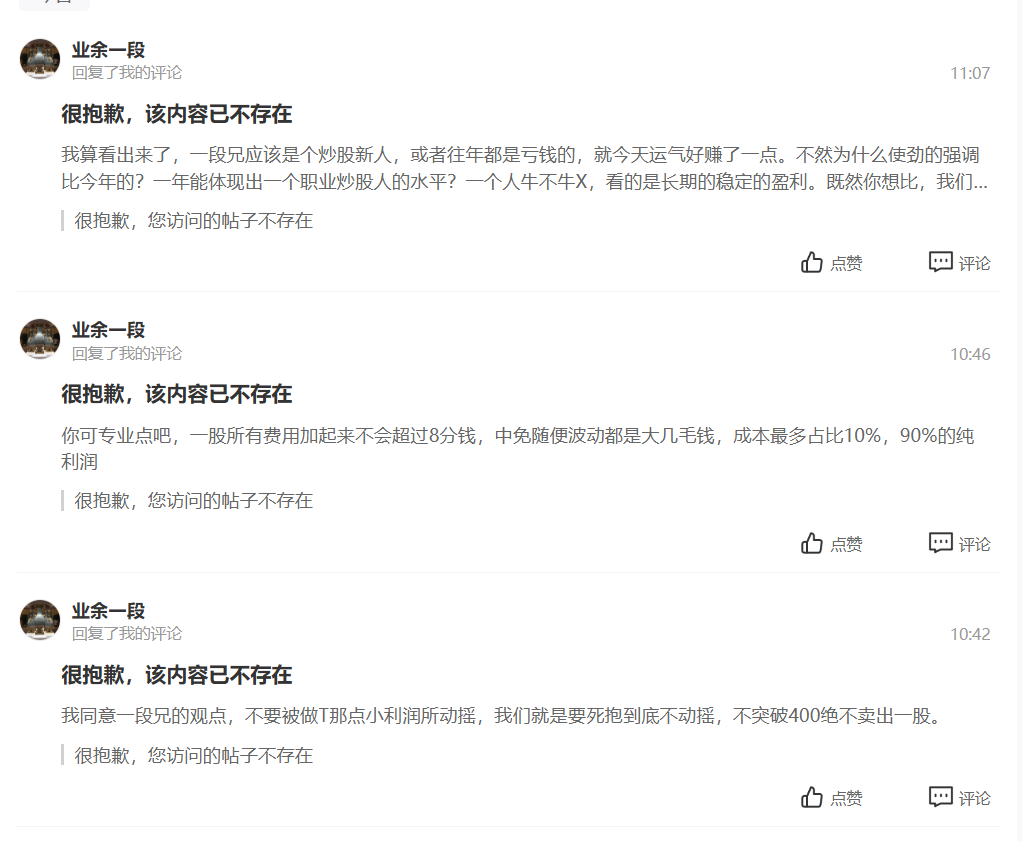 真是恶心到我了。一段小弟你一而再再而三的要和我比收益,前二次我都没理你,谁知道你一直叫嚣。我现在发收益截图了,你不断不敢跟,居然把要和我比收益的帖子删了,还禁止我在你的帖子留言,再看把我拉黑了。还好我都截图保存了,不然不知道你又会怎样颠倒是非。就你这点能耐还在我面前叫嚣,真是个笑话。一段兄的粉丝们来看看,这就是你们信封的真神,哈哈笑死我了!