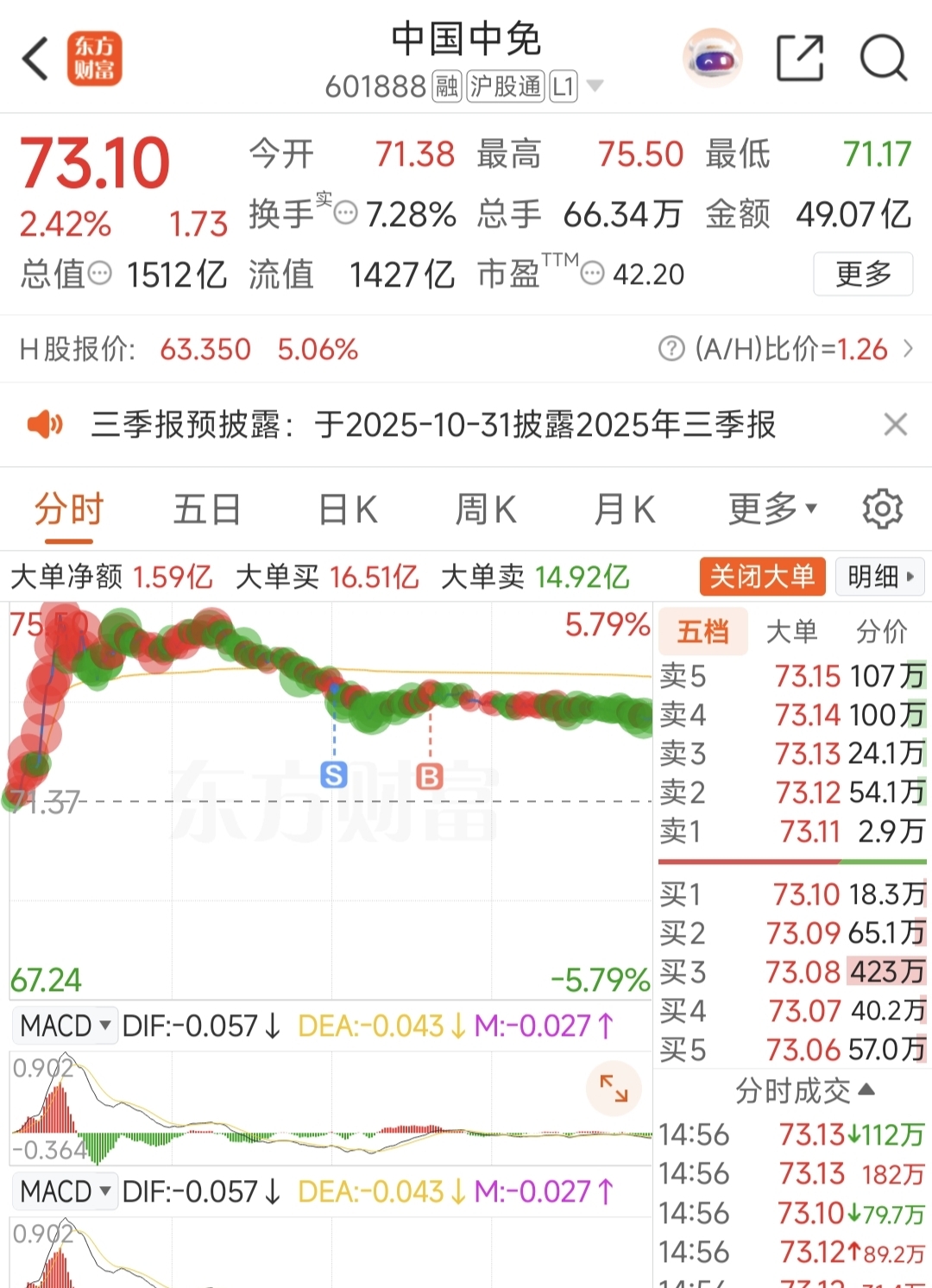 $中国中免(SH601888)$ 我太相信中免这个趋势了,但中午看小型纳指崩盘,还是在73.72选择了卖出,又在73.69害怕T飞接回,还不够今天的手续费,这两个字母送给自己。