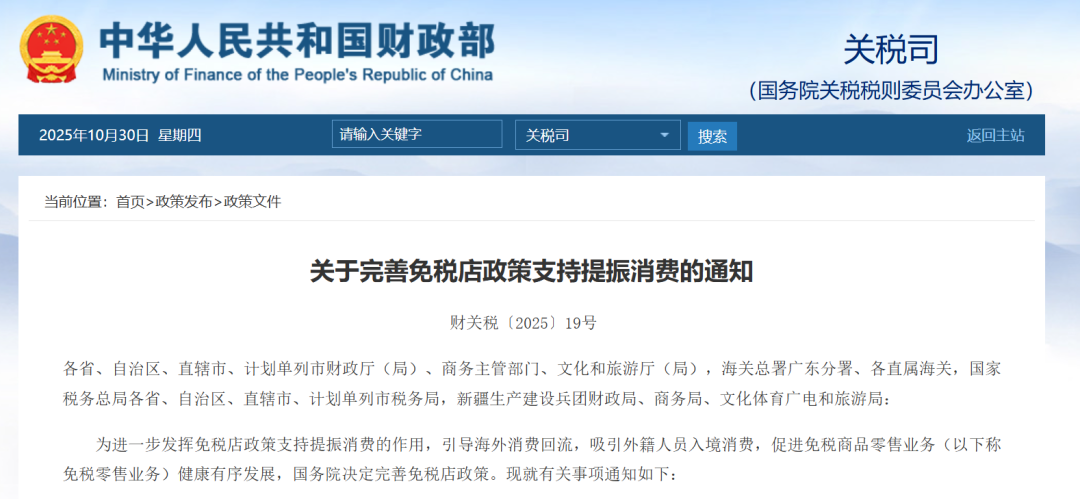 10月30日盘后,财政部等五部门发布关于完善免税店政策支持提振消费的通知。