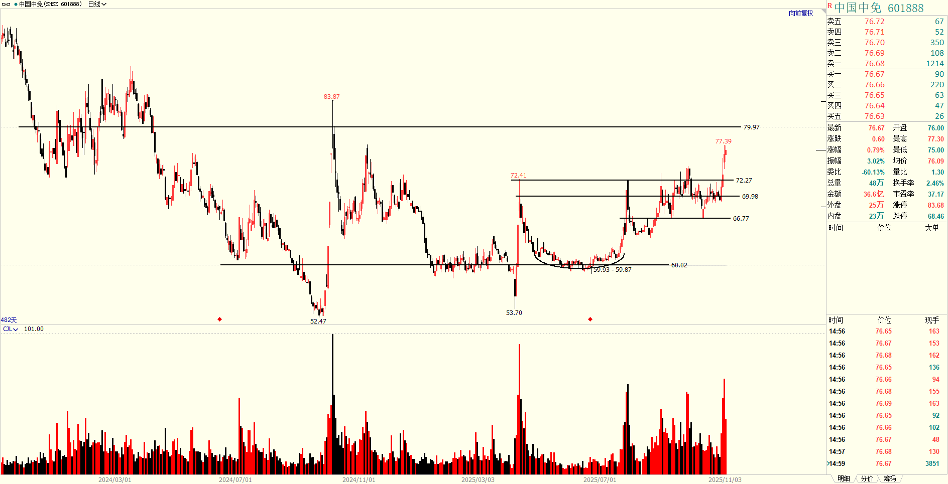 一把直尺打天下/中国中免60区域圆弧底,加上66.77-73之间横盘中继,持续看