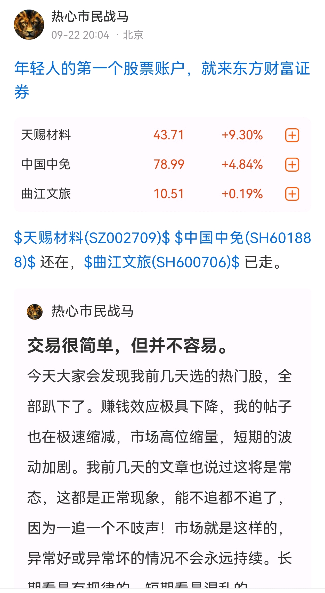 $中国中免(SH601888)$ $天赐材料(SZ002709)$ 股市哪有常胜的将军,都是浮动的数字游戏,只不过是坐了人家的车,但也要想好什么时候下车!