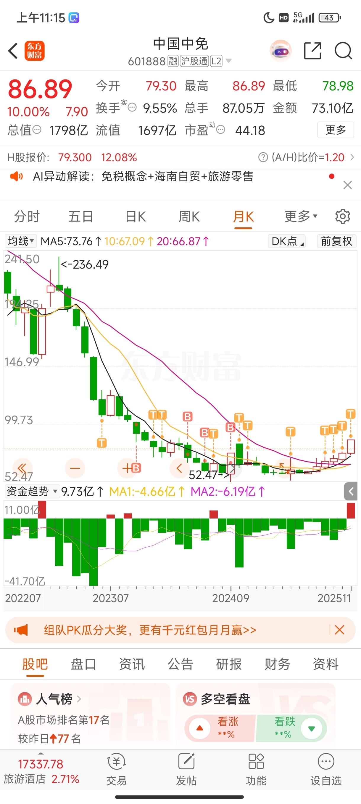 $中国中免(SH601888)$ 老子玩中免玩了三年,错过了银行,错过了黄金,错过了科技,最高亏50个点,如今终于守得云开见月明了,老子想哭。
